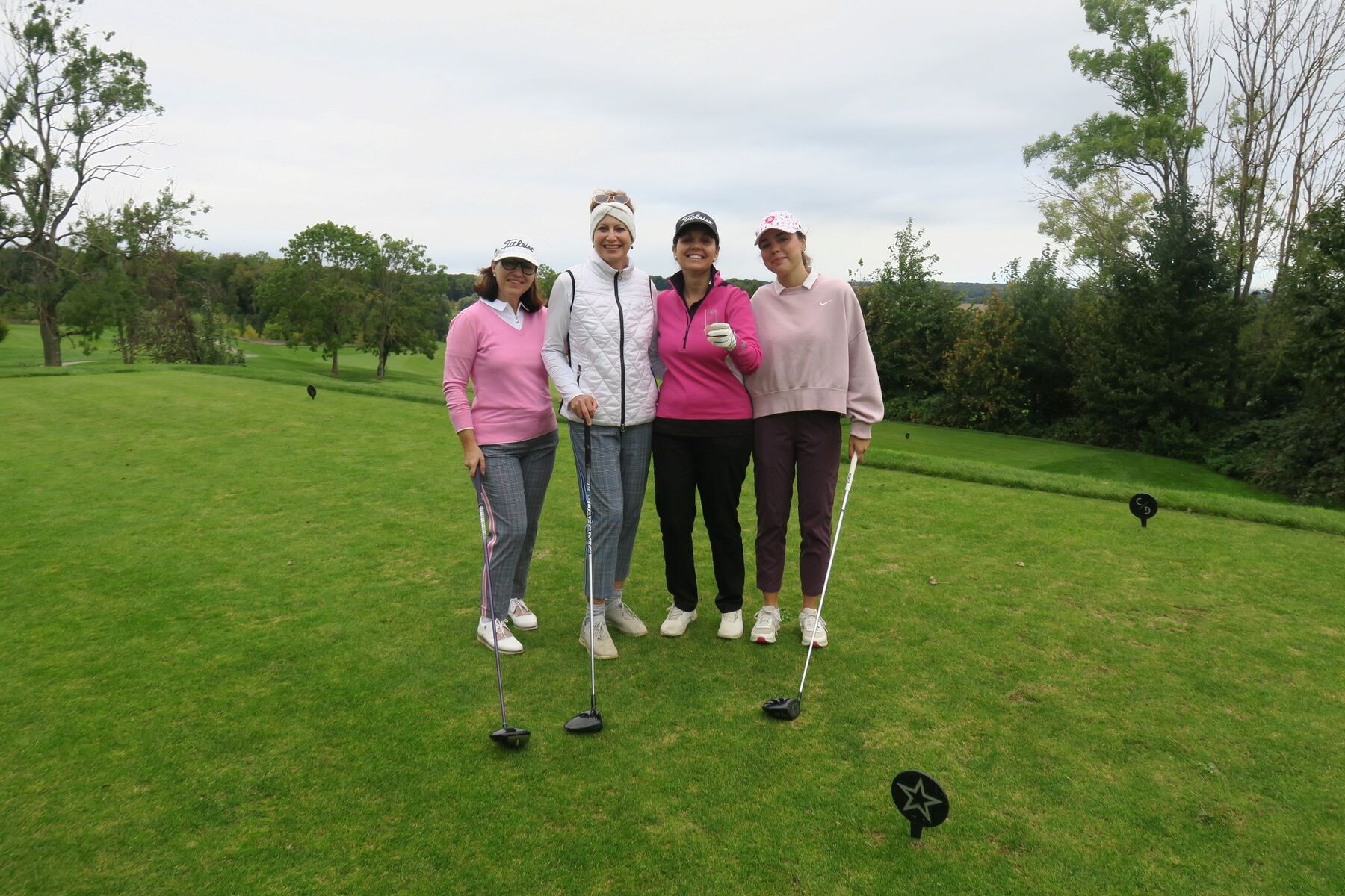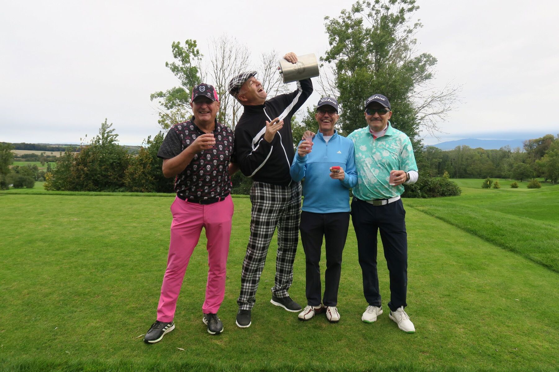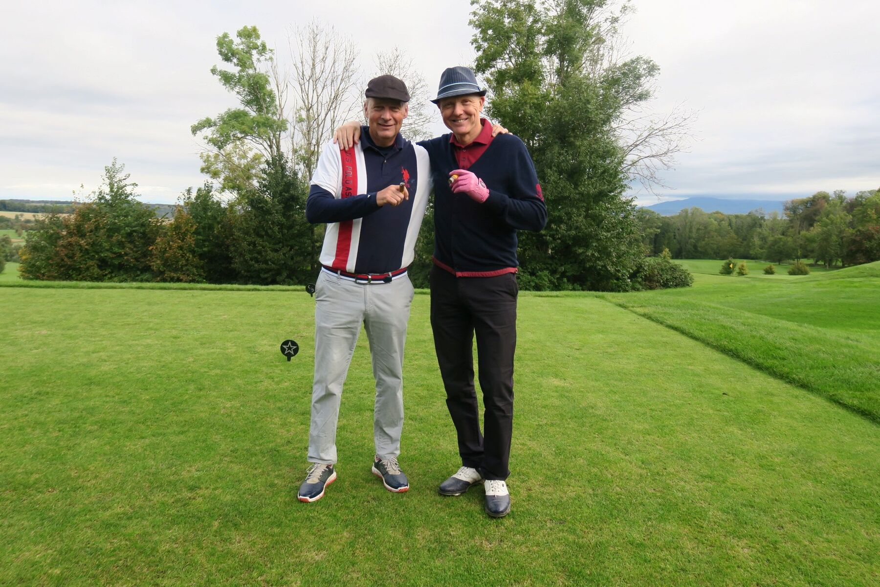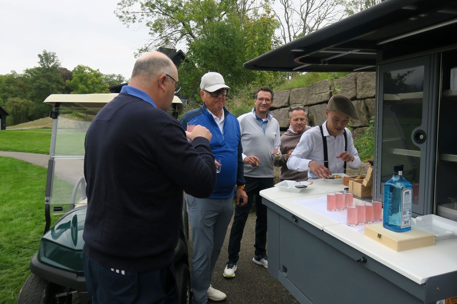 Zwar fielen ein paar Regentropfen, doch der guten Stimmung tat das keinen Abbruch – Gin-Shots und Zigarren am ersten Abschlag brachten gute Laune und den passenden Auftakt. Während der Runde gab es nebst noch mehr Gin eine stärkende Zwischenverpflegung im Halfway House.